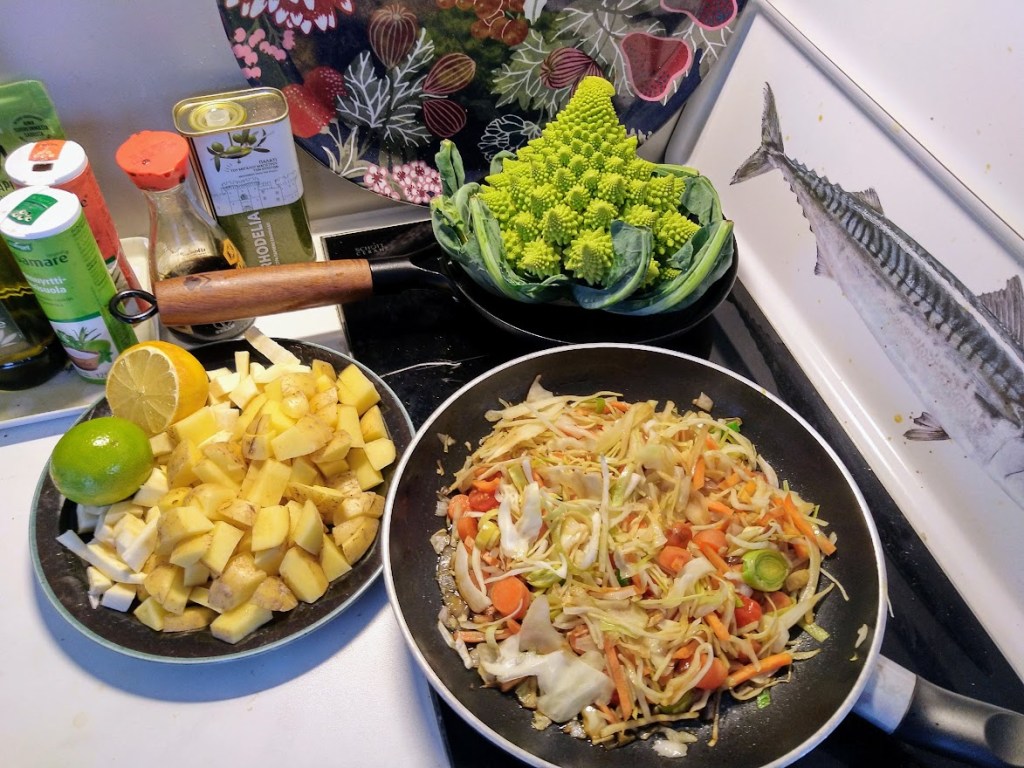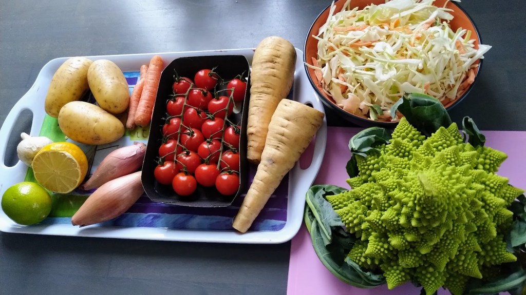 Käytin perunaa, palsternakkaa, kaali-porkkana-purjosuikaleita sekä salotti- ja valkosipulia sekä terttutomaatteja.