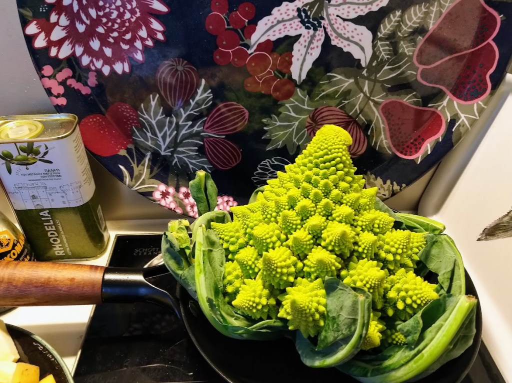Ihastuin kaupassa vihreään romanescoon. Leikkasin sen lehdet ja kantaosan muhennokseen ja höyrytin kauniin latvan.