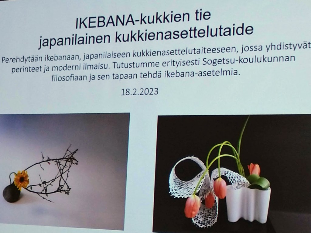 Opimme, että kaiken lähtökohta on rakkaus luontoon. Ikebanassa tärkeää on linjan kauneus, epäsymmetria, vastakkaisten voimien tasapaino, tilankäyttö (tyhä tila on osa asetelmaa), kolmeulotteisuus ja hillitty kauneus. Pääsemme itse kokeilemaan asettelua seuraavalla kerralla. Odotan innolla.