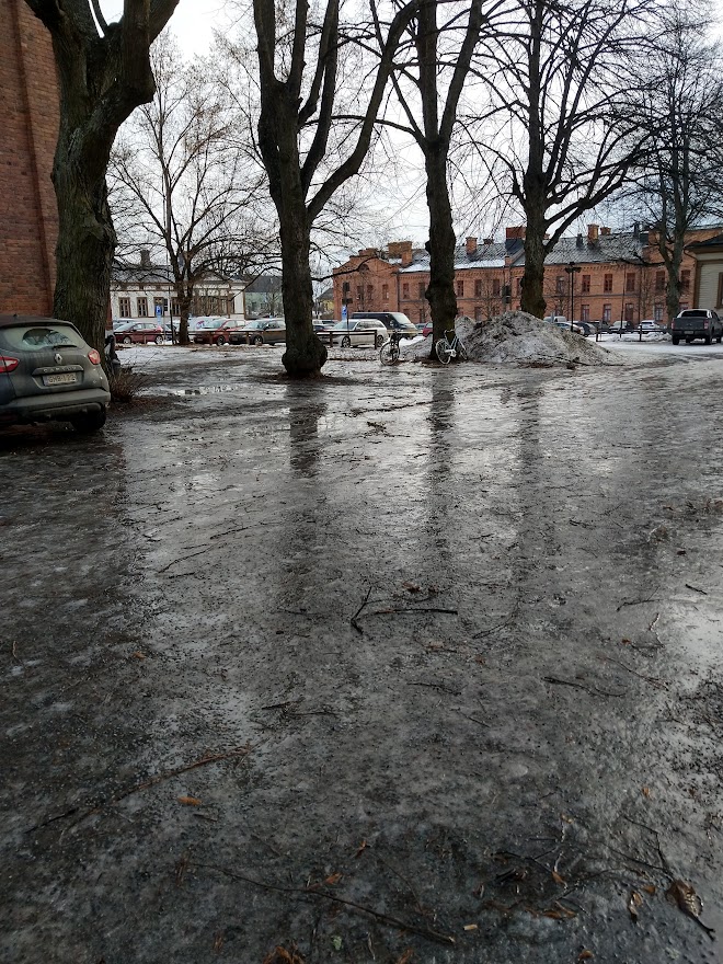 Sää kuin huhtikuussa. Näin Radio Suomi kertoi. Päivälämpötilat ovat plussan puolella ja yöt pakkasella. Se takaa, että liukkaat kelit jatkuvat.