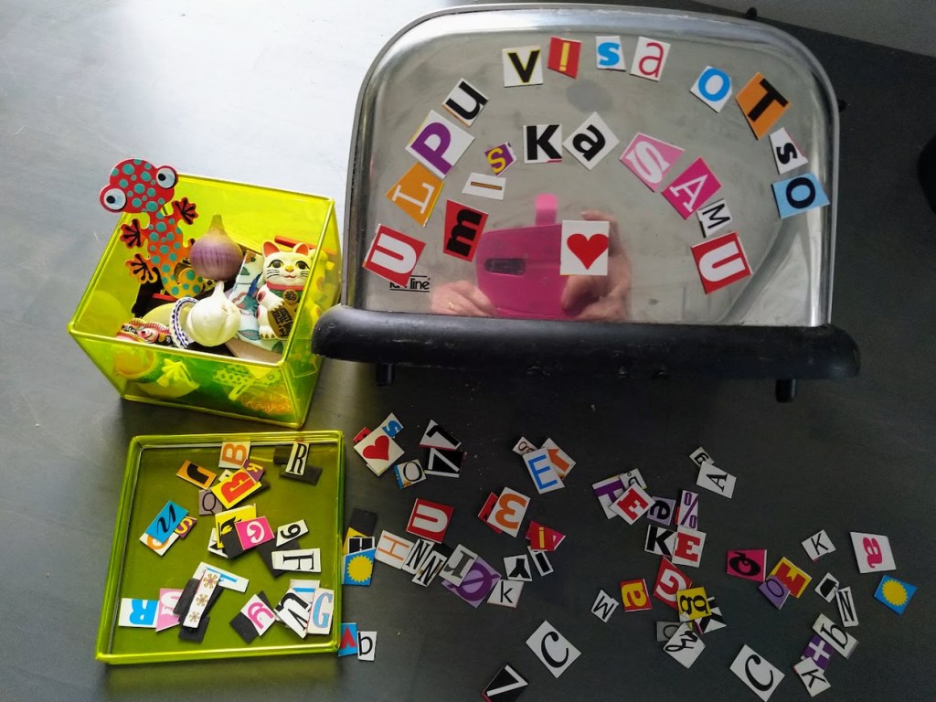 Visa sen sijaan piti minulle seuraa. Poika tutki kaikki komerot ja teki hyviä löytöjä. Luulin vieneeni magneettikirjaimet mökille, mutta niitä löytyi lisää kirjahyllystä.