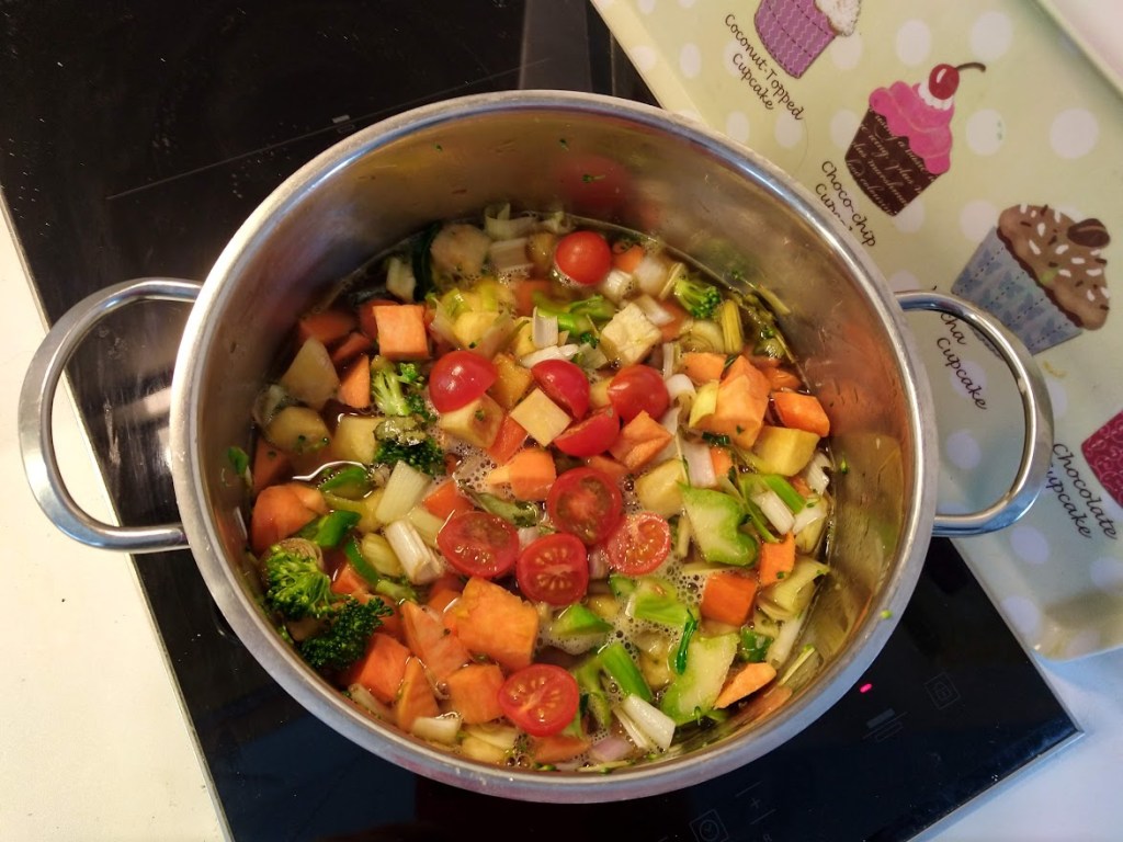Bataatti ei ole kuulunut lempijuureksiini makeutensa vuoksi, mutta päätin antaa sille mahdollisuuden. Kokkasin kasviskeiton, johon käytin otsikkokuvan aineksia. Ostin juureskuutiot valmiina, sillä se säästi aikaa ja vaivaa.