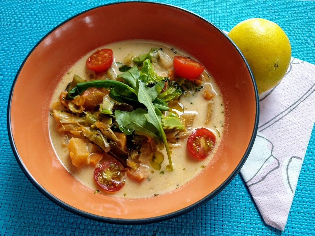 Käytin nesteenä kookosmaitoa ja maustoin thaityyliin limetinlehdillä, chillä, tuoreella inkiväärillä, valkosipulilla ja soijakastikkeella.