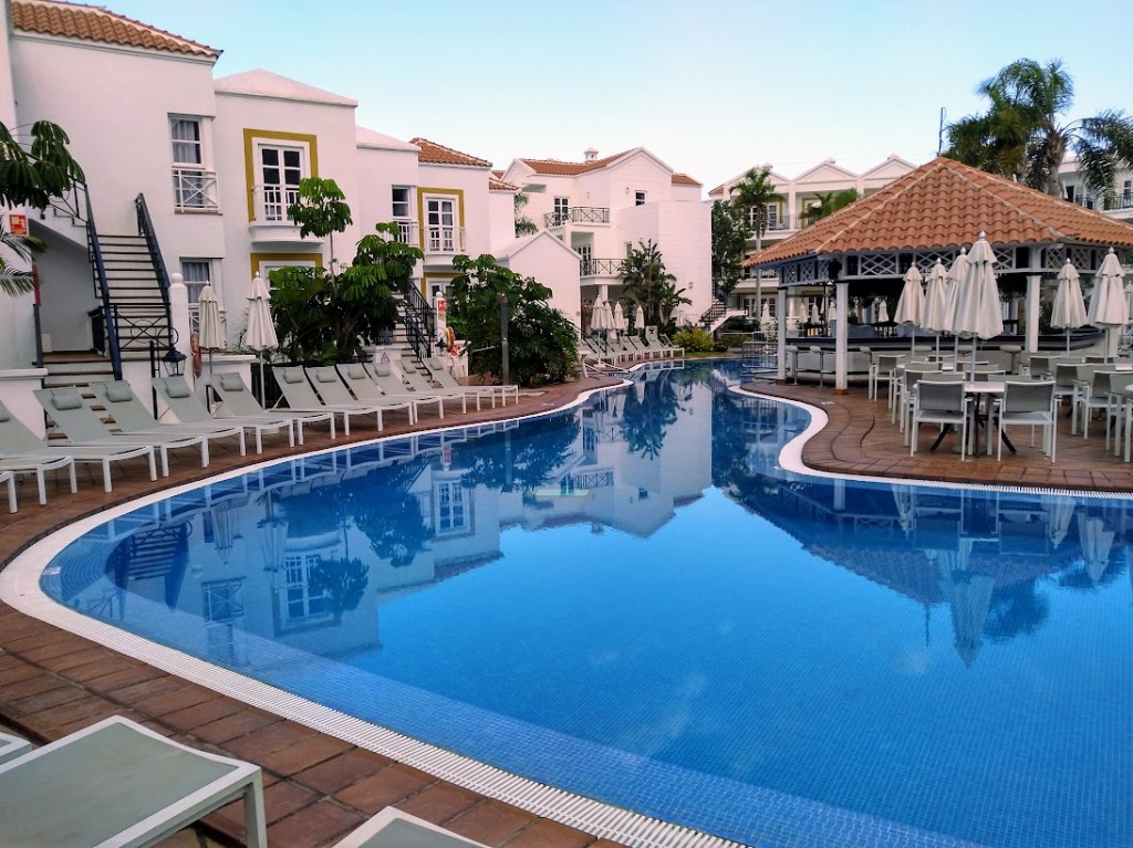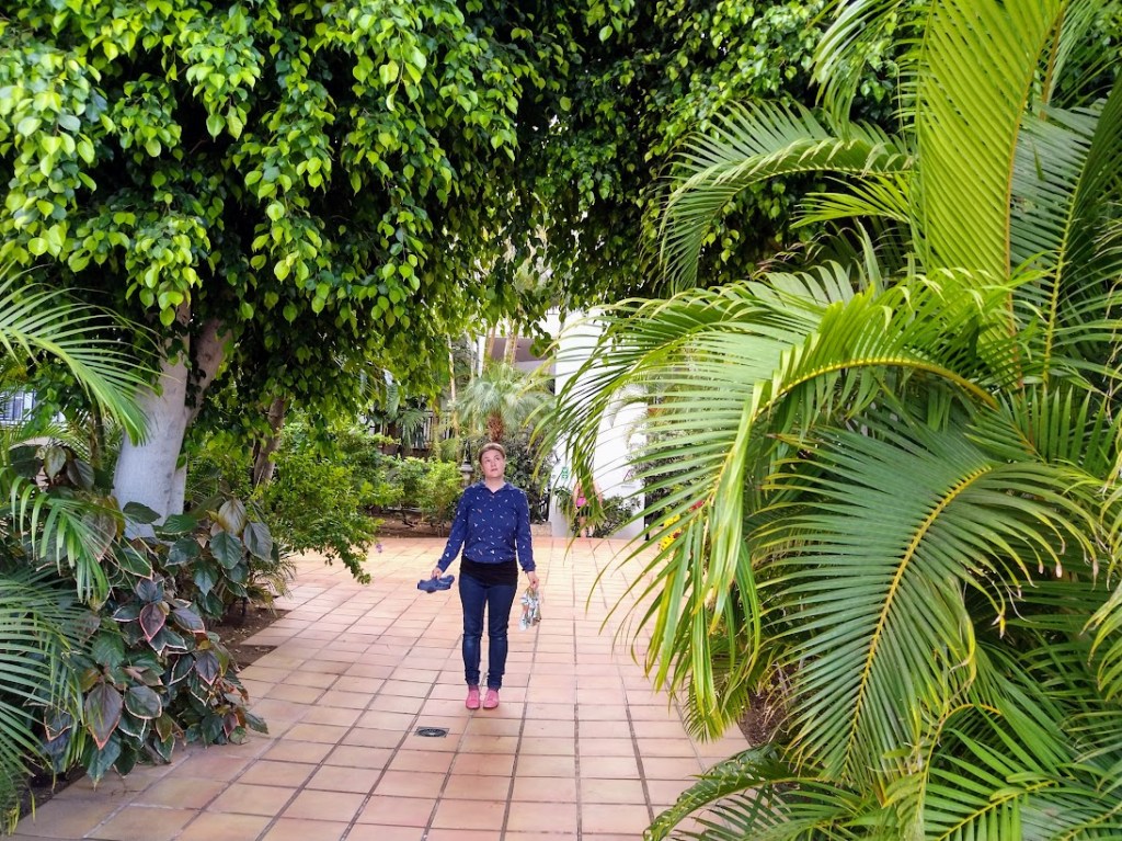 Hotellin pihapiiri on rehevä ja kaunis. Lämmitetty uima-allas on alueen keskellä ja kodikkaat huoneistot sen reunamilla. Olemme varanneet puolihoidon. Buffetaamiainen oli runsas ja herkullinen. Churrot olivat meheviä ja hedelmävalikoima ylellinen. Tarjolla on jopa tuoretta papaijaa, nam.