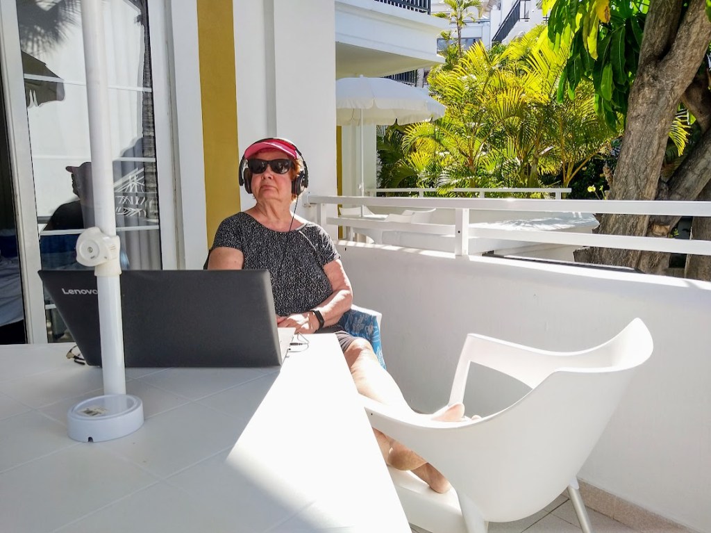 Vietin rauhallisen aamupäivän omalla terassilla hyvinvointivalmentajien seurassa kuunnellen luentoa.