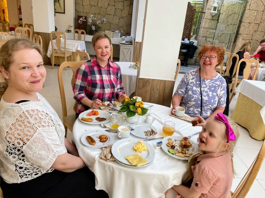 Päivärytmi on jo tuttu. Lapset haluavat heti aamiaisen jälkeen altaalle uimaan. Puolen päivän aikaan heillä on jo kiljuva nälkä.