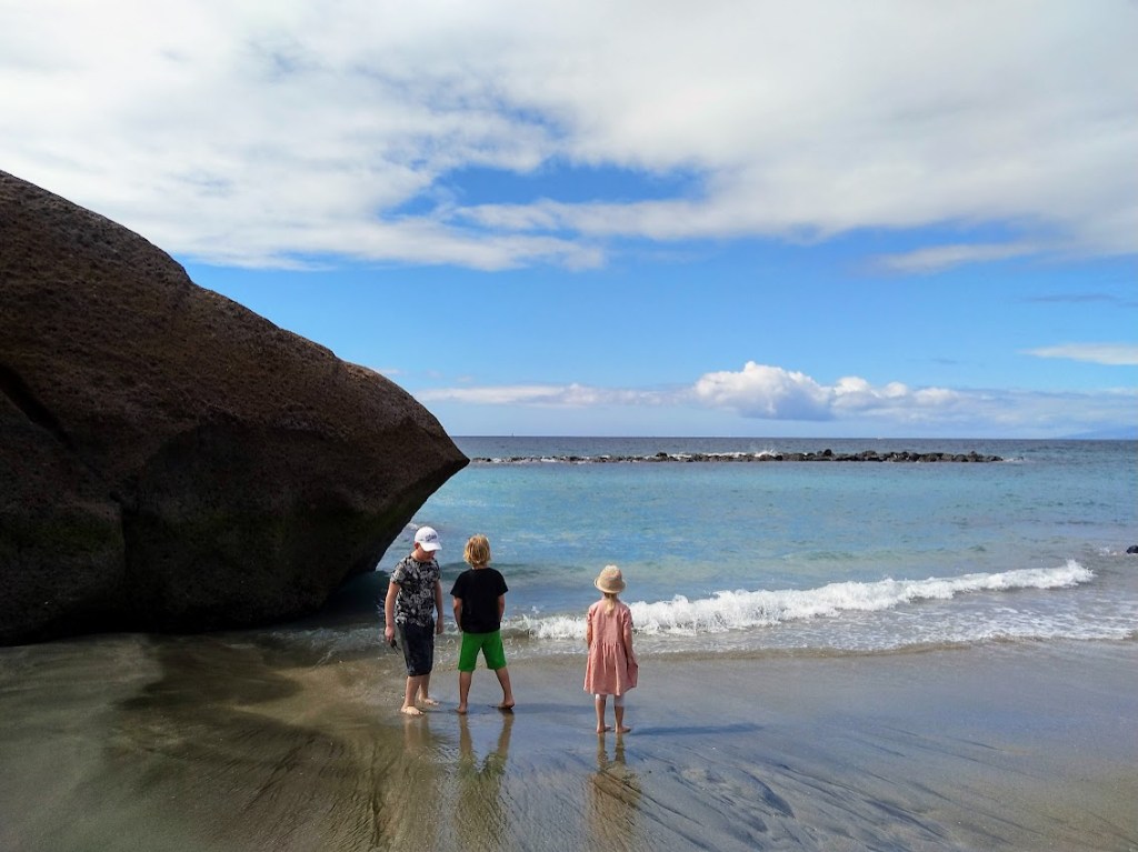 Lapset ihastuivat valtamerren aaltoihin ja olivat pian märkiä. Jätin heidät kirmailemaan ja palasin omalle rantakadulle.