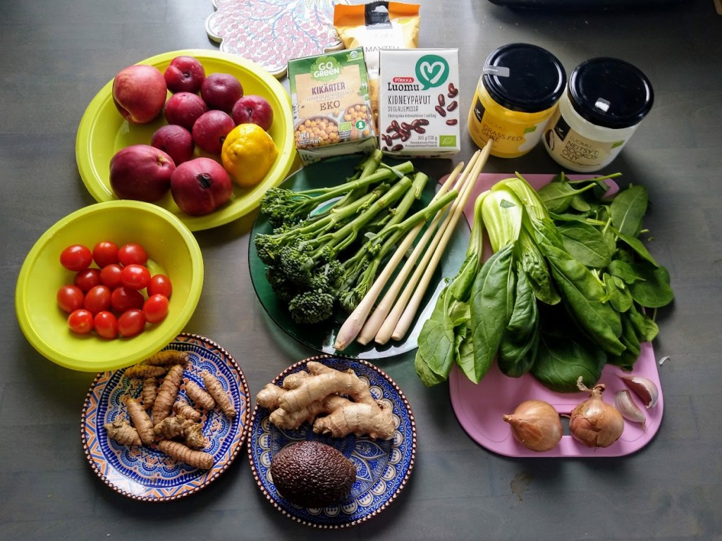 Valitsen nykyään kaupassa värikkäitä aineksia. Kuvan etualalla olevat pötkylät eivät ole toukkia, vaan tuoretta kurkumaa.