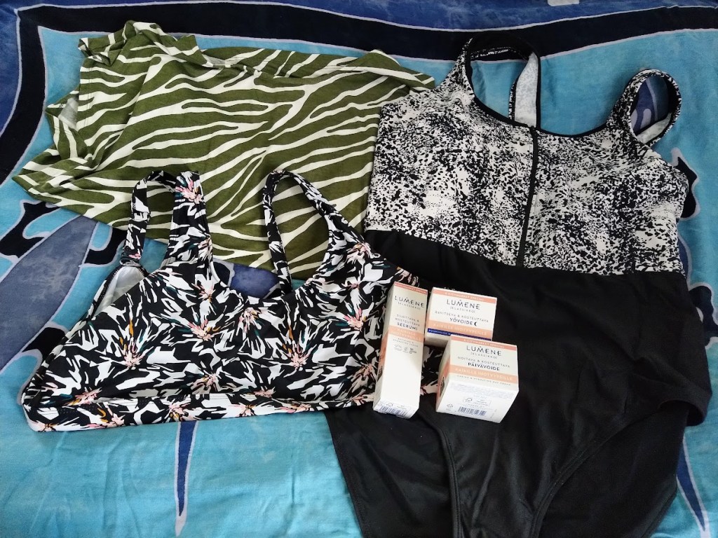 Nyt kun olen pudottanut painoa ja innostunut uimisesta, oli ihan pakko ostaa sopiva uimapuku. Edellinen lökötti ikävästi. Mukaan tarttui myös kesäpaita ja bikinit. Kelpaa nyt lähteä matkalle ja voihan näitä ihanuuksia käyttää mökilläkin.