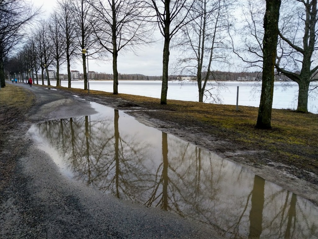Ehdin jo iloita, kun pihapiirini on vihdoinkin sula. Kokkareinen jääpeite ja vesi sen päällä oli järkyttävän kamalaa. Ilo jäi lyhyeksi, sillä lumipyry pyyhkäisi illalla Hämeenlinnan yli. Nyt aamulla maa on valkoinen. Ei auta, kuin laittaa taas ulos lähtiessä piikkikengät jalkaan.