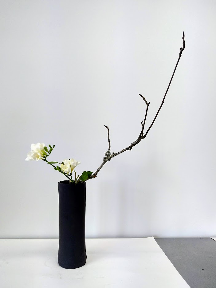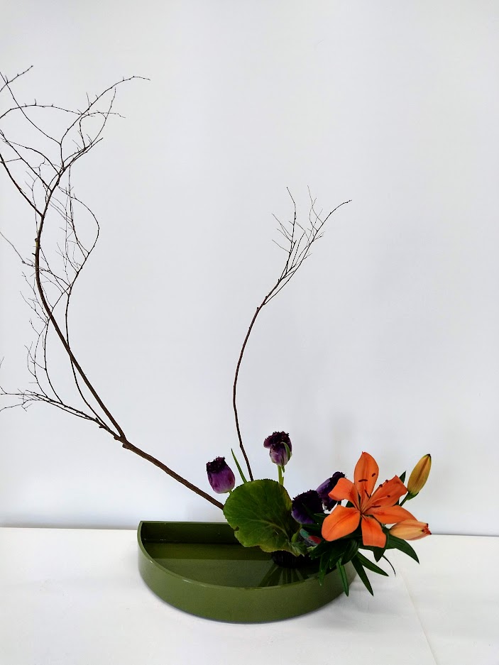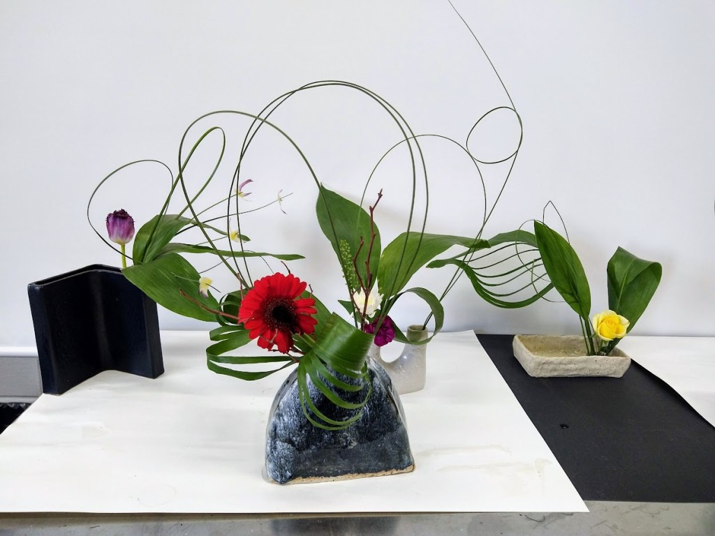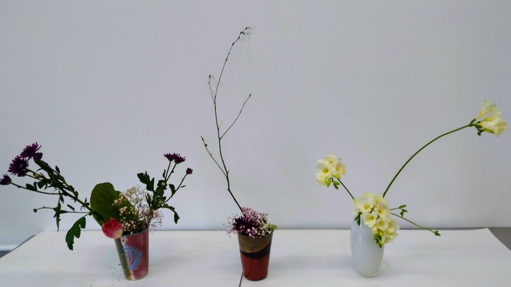 Opettaja on taitava ja innostava. Hänellä on 47 vuoden kokemus tästä taitolajista. Opettajalla oli järviruokoa ja erilaisia oksia harjoitusmateriaalina. Rakensimme oikeaoppisen asetelman putkiloista ennen kuin pääsimme kokeilemaan kasvien parissa.