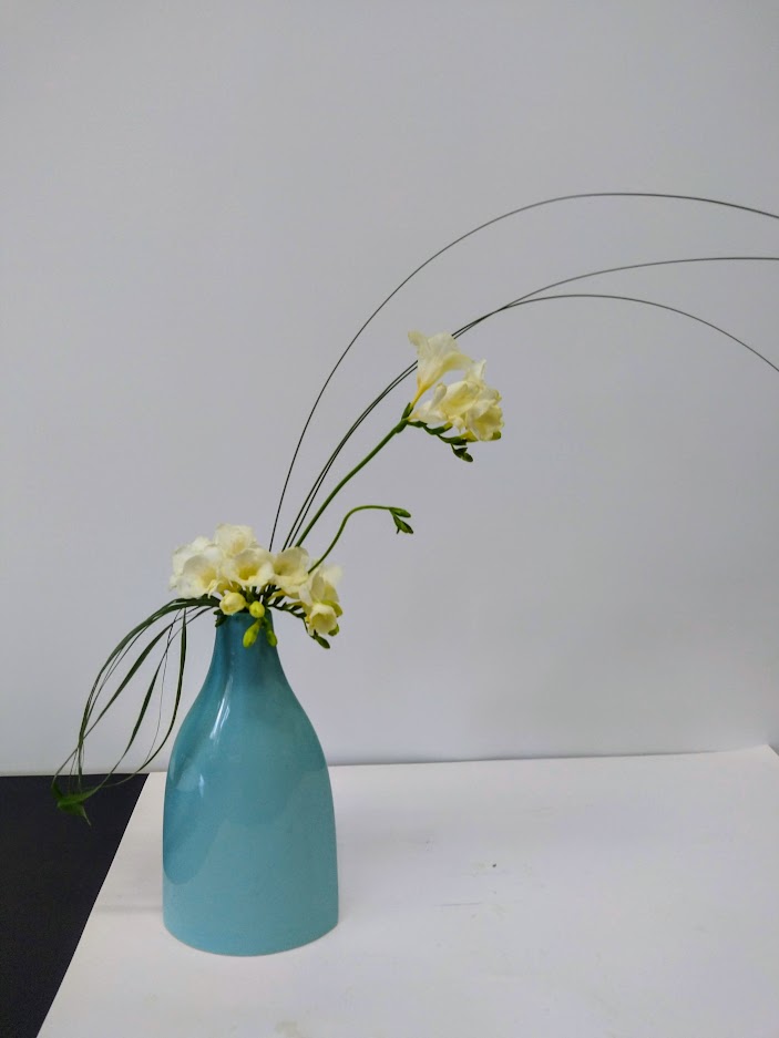Minulla oli mukana koivunoksia, harsokukkia ja valkoisia freesioita. Olin oikein tyytyväinen ensimmäisen päivän aikaansaannoksiini, vaikka opettaja karsikin niitä reippaasti.