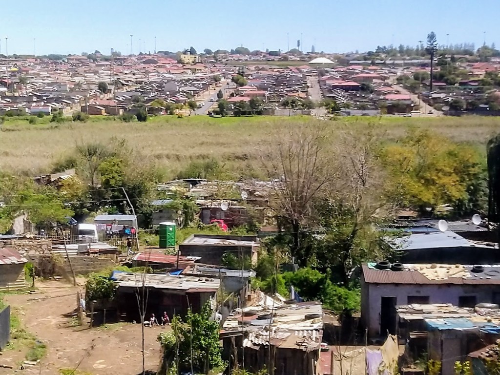 Meillä oli Sowetossa parin tunnin kaupunkikiertoajelu. Tummaihoiset karkotettiin townshipiin Johannesburgin keskustasta rotuerottelun aikaan. Näimme aaltopellistä kyhättyjä majoja slummialueella, mutta myös uusia hyvin hoidettuja taloja. Viehättävä paikallisopas Queen kertoi vuolaasti Soweton historiasta.