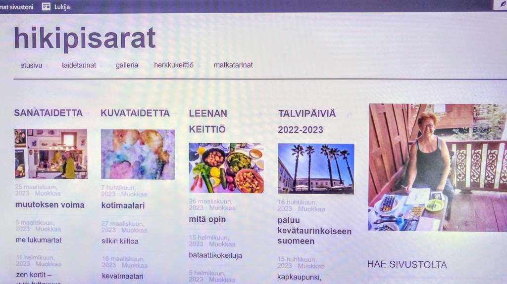 Vaihdoin maksulliseen WordPressiin ja olen tyytyväinen, kun digitaitoinen poikani Miika räätälöi nykyisen sivustoni niin, että siinä on omat osiot luovalle kirjoittamiselle, kuvataiteelle, kokkaukselle sekä tietenkin matkoille. Olen kirjoittanut pikkutytöstä lähtien päiväkirjoja. Nyt hikipisarat toimivat sähköisinä päiväkirjoina. Seuraajiakin on, saan joskus ilokseni jopa kommentteja.