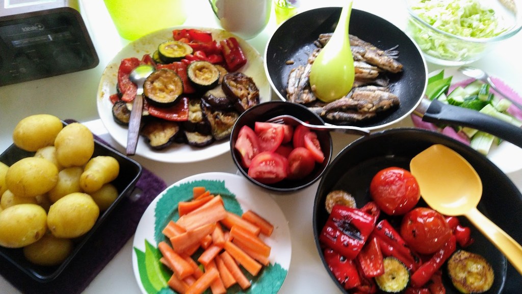 Sadepäivänäkin kokkaus ulkona muurikalla onnistui, Minä esikäsittelin kasvikset ja pesin perunat. Miika paistoi valkosipuliöljyllä valellut tomaatit, kesäkurpitsat, munakoisot ja paprikat. Tarjolla oli niiden lisäksi kurkkuja, salaattia sekä edellisenä iltana paistettuja muikkuja.
