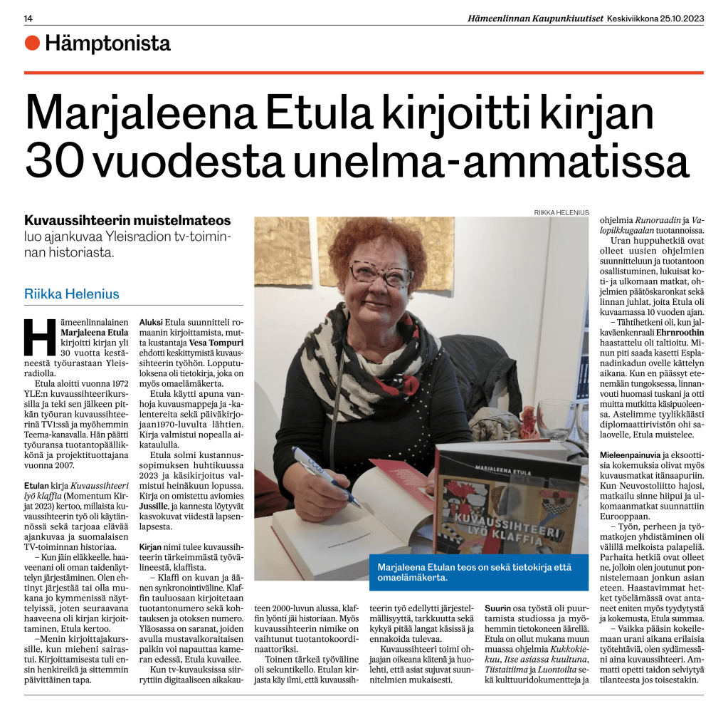Ystävätoimittaja Riikka Helenius osallistui 7.9.2023 kirjani Kuvaussihteeri lyö klaffia julkaisutilaisuuteen Helsingissä. Kaupunkiuutiset julkaisi vasta nyt jutun, mutta hyvä niin, sopivasti Helsingin kirjamessujen alla.