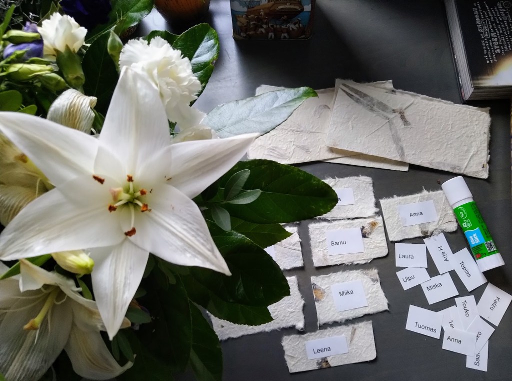 Enää kolme päivää odotusta. Järjestelyt etenevät. Miika on taittanut ohjelmalehtisen ja minä olen laittanut pöytäjärjestyksen taas uusiksi, sillä meitä on nyt 50. Hyvä, etten suunnitellut muistotilaisuutta kaksiooni. Jos olisi kesä, kokoontuisimme mökille, mutta nyt sinne ei ole asiaa.