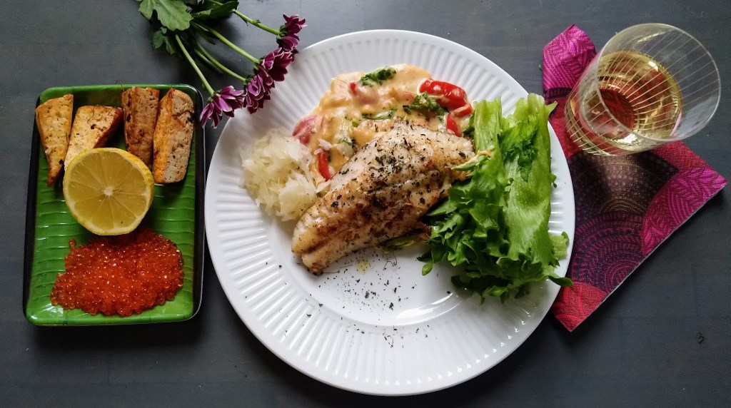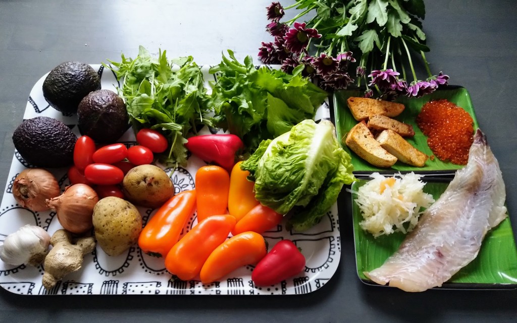TARJOLLA TUOREITA KASVIKSIA, TOFUA, MÄTIÄ, HAPANKAALIA JA PUNA-AHVENFILE