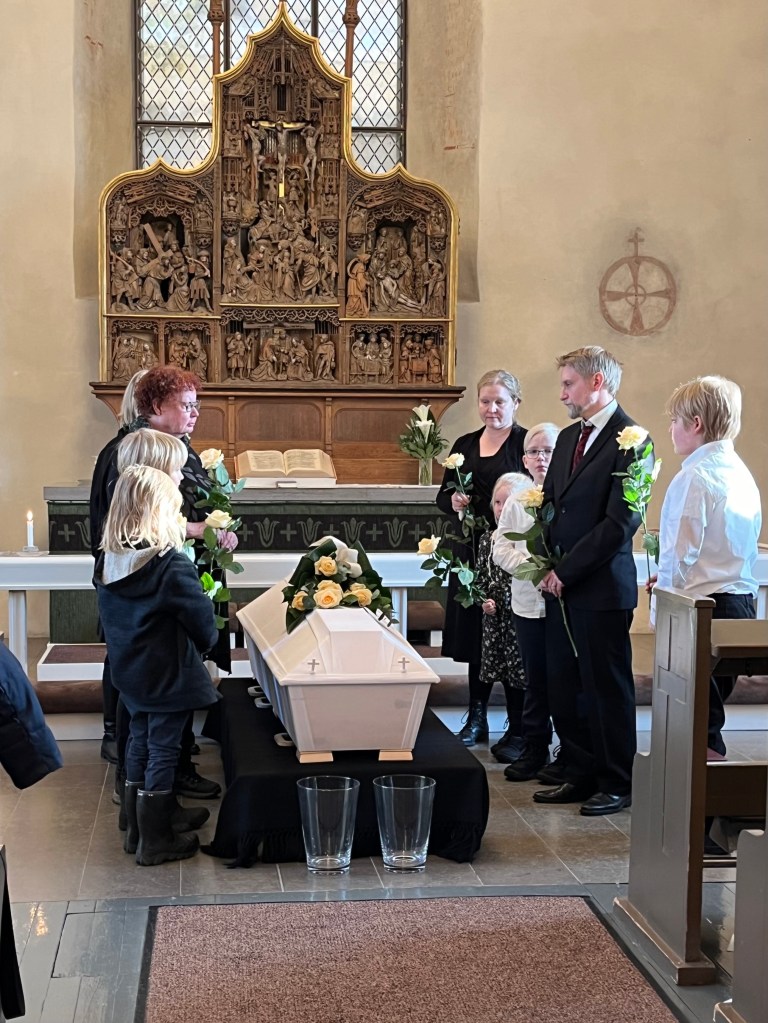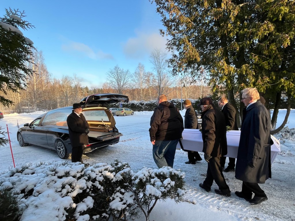 He kantoivat arkun sivuovesta ulkona odottavaan hautaustoimiston autoon. Me saattajat seurasimme kulkueena perässä.