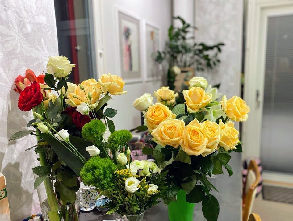 Pieni kaksioni oli täpötäynnä, kun Annan ja Miikan perhe sekä Esko, Arja ja Timon perhe poikkesivat muistotilaisuuden jälkeen. Jaana oli tuonut tuliaisiksi juustoja, keksejä ja Côtes du Rhônea vanhojen aikojen kunniaksi. Esko ja Arja jäivät iltapalalle kanssamme ennen kuin palasivat hotellille. Vaihdoimme Jaanan kanssa oloasut ja majoituimme sohvalle muisteluihin. Pöydällä tuoksui kymmeniä ruusuja, jotka hohtivat kynttilänvalossa.
