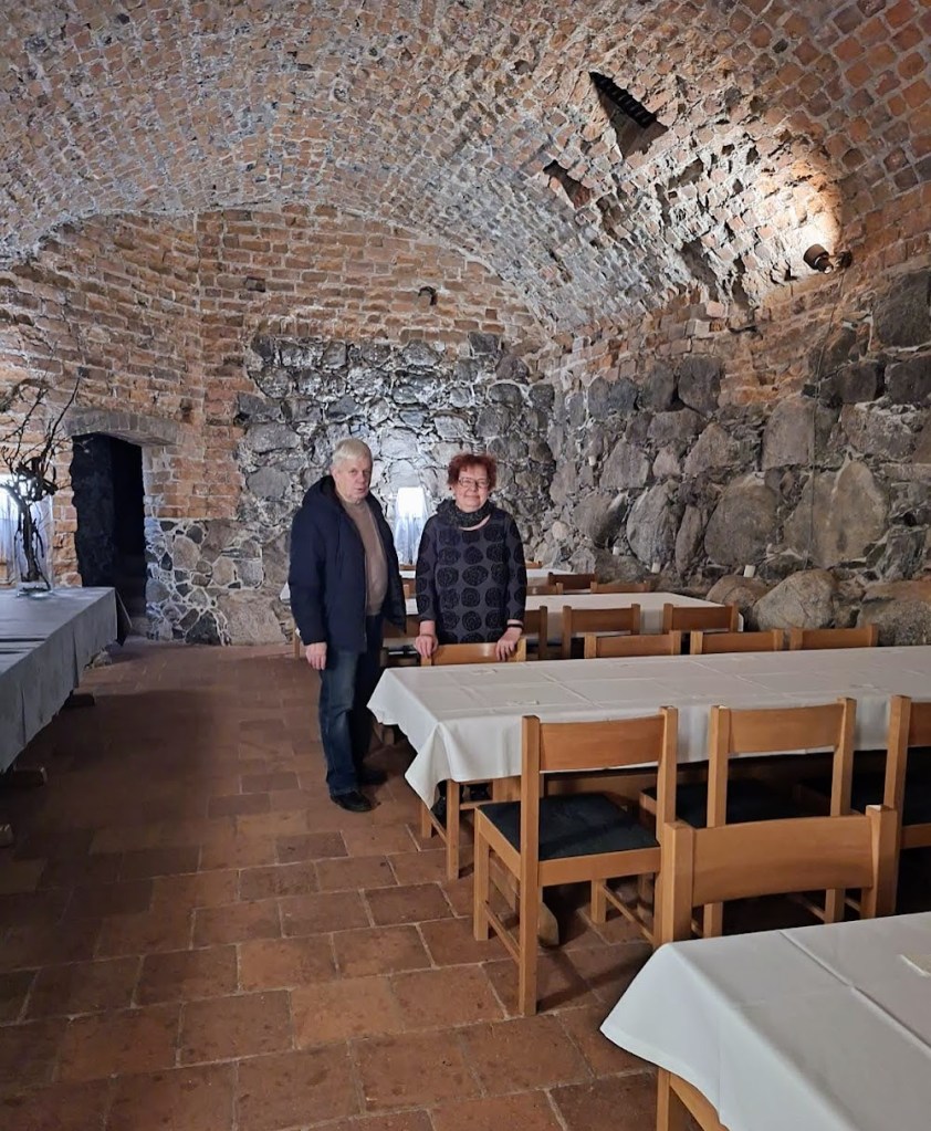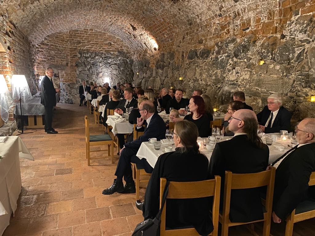 Hämeen linnan linnatuvassa kaikki oli valmista, kun saavuimme vähän ennen kahta paikalle. Tunnelmallinen sali on valaistu kynttilöin. Ehdin hetken huolestua, miten vieraat löytävät paikkansa, sillä nimikortteja oli hankala lukea hämärässä. Kaikki sujui kuitenkin ripeästi ja pääsimme nauttimaan herkullisesta lohikeitosta, erinomaisista salaateista ja jälkiruokaraparperipiiraasta ennen adressien lukua.