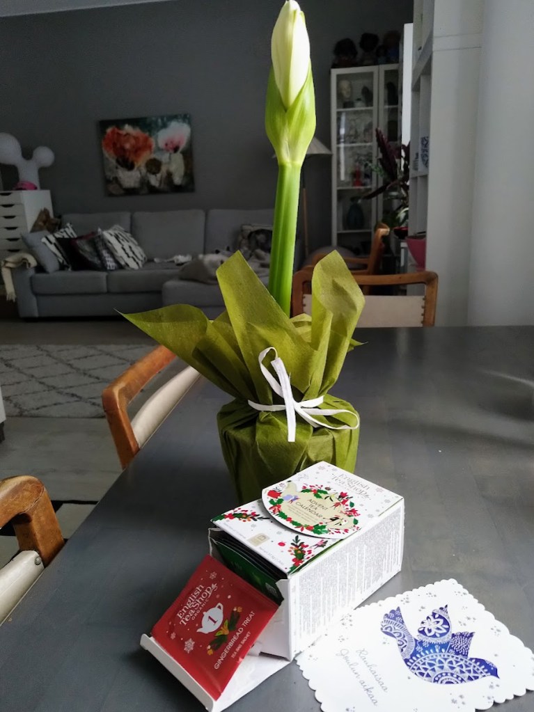 Ystävät ovat parasta yksinäisinä päivinä. Ilahduin eilen, kun Kaisa Kynäilijät-ryhmästämme ilmoitti poikkeavansa. Hän tuli päiväkahviaikaan tuliaisina gluteenittomia leivonnaisia, teepussijoulukalenteri ja valkoinen amaryllis. Viikon vanhat ruusut pöydälläni olivat jo kuihtumispisteessä. Keitin kahvit ja suunnittelimme seuraavan kesän kirjoittajakursseja.