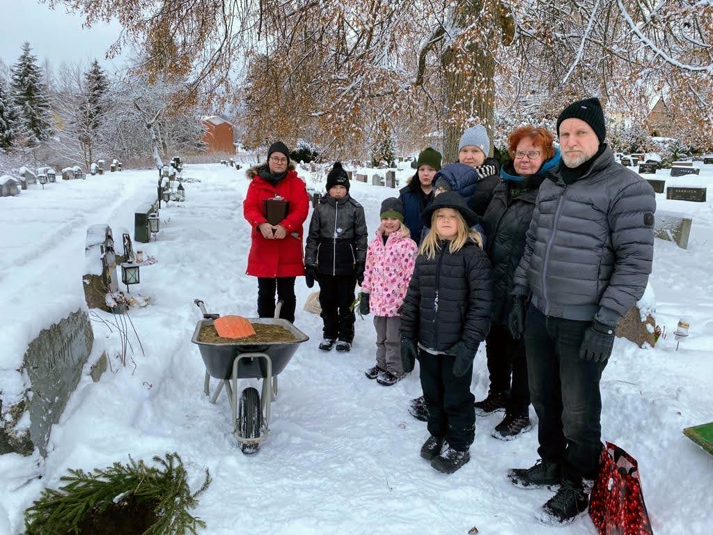 Tapasimme Miikan perheen ja seurakunnan edustaja Annin hautausmaan portilla. Uurnanlasku on koruton tilaisuus. 60 cm syvä kuoppa oli kaivettu käsivoimin valmiiksi.