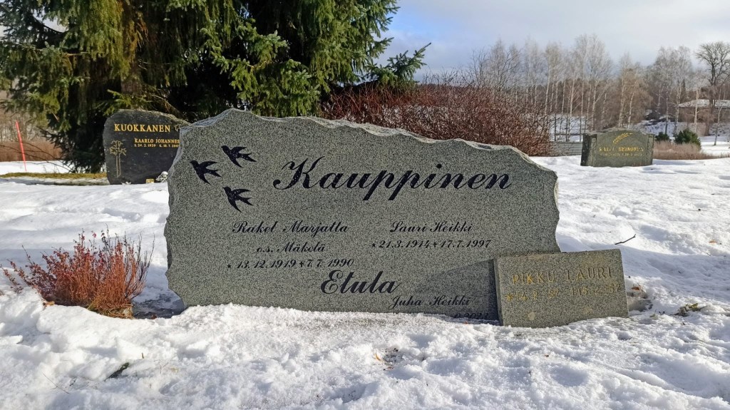 Hautakiven kaiverrus onnistui helmikuussa. Anna ja pojat kävivät talvilomaviikolla mökillä ja poikkesivat tarkistamaan lopputuloksen. Kivessä on tilaa vielä minun ja siskonkin nimille.
