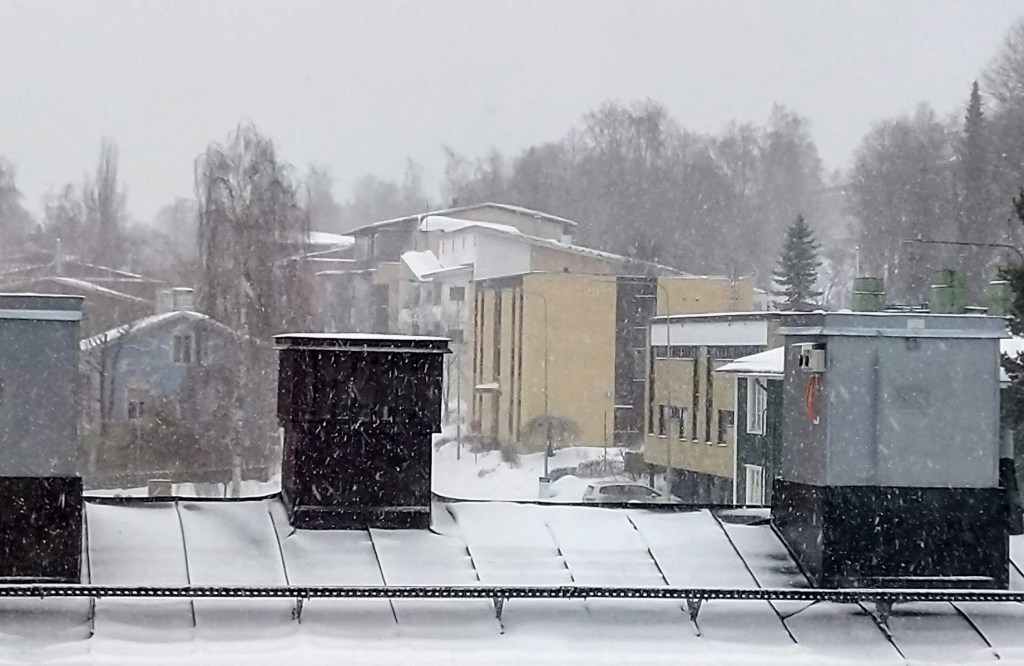 Lumisade jatkuu tänäänkin. Olen tyytyväinen, että jääkaapissa on valmista ruokaa, eikä ole pakko lähteä mihinkään. Etelän talvilomat ovat alkaneet ja odottelen nuorisoa käymään, mutta todennäköisesti vasta huomenna.