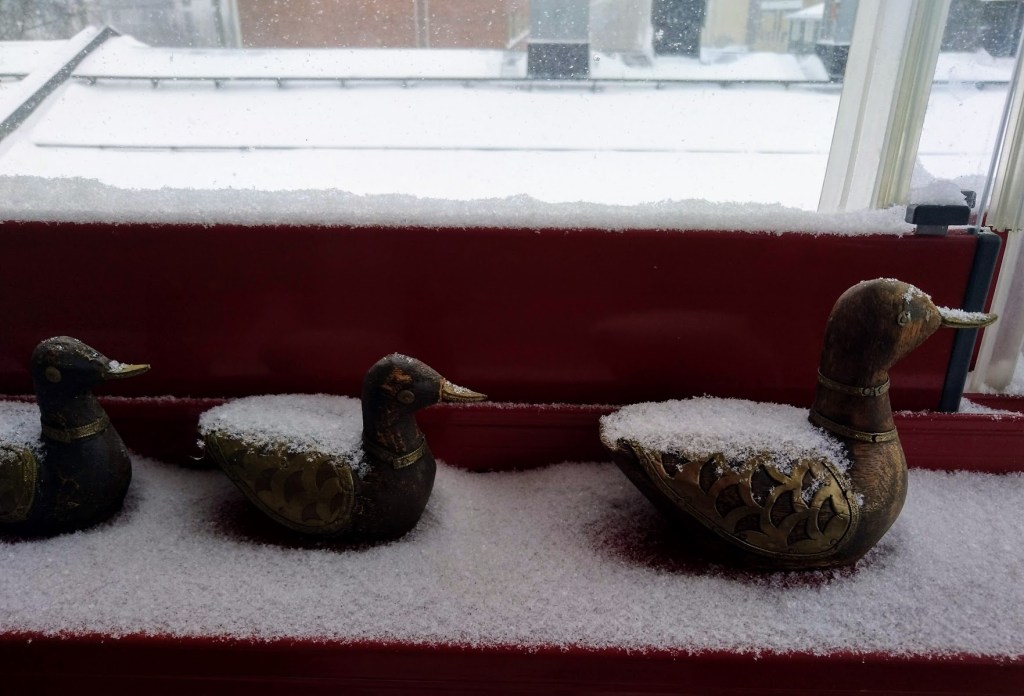 Olin unohtanut parvekelasit auki ja lunta oli kaikkialla. Onneksi tänään ei ole pakko lähteä mihinkään.