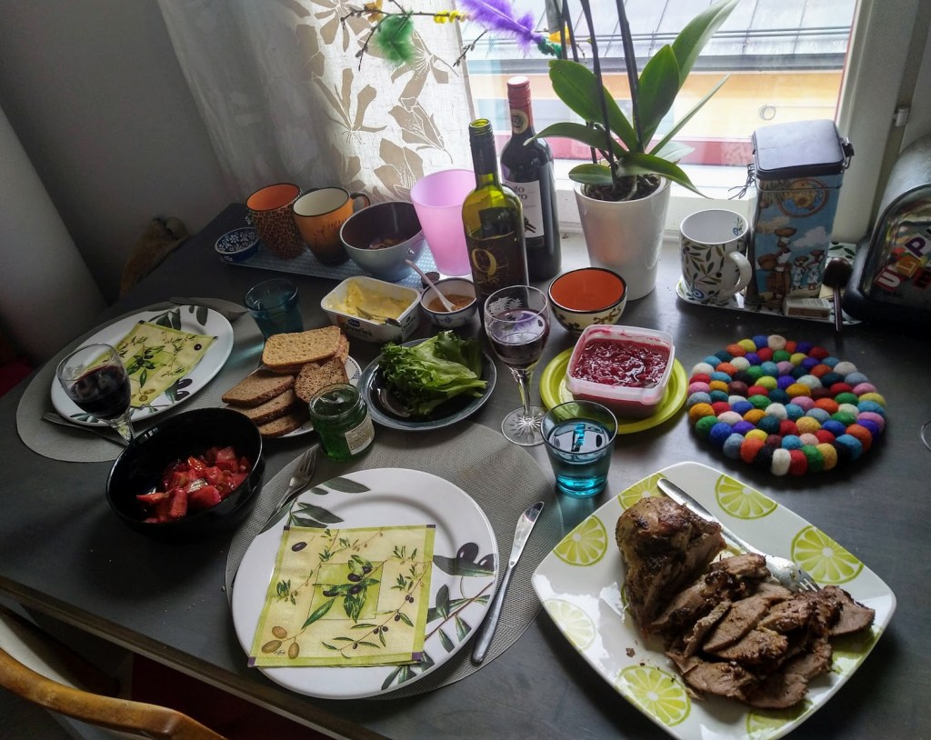 Pitkäperjantai tuntui pitkältä, sillä ulkoilu jäi vähiin sadesään vuoksi. Keittiössä tuoksui hyvältä, kun laitoimme karitsanpaistin uuniin. Minulla on niin tekninen älyliesi, että kypsennys vaati insinööritaitoja. Aikaa meni kauemmin kuin arvelimme, sillä uuni keskeytti itsensä pari kertaa. En tiedä miksi. Lopputulos oli kuitenkin herkullinen.