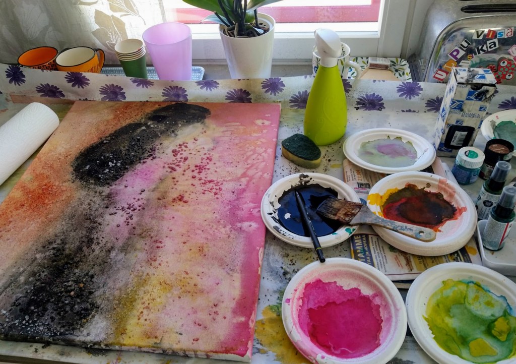 Eilen oli se päivä, kun otin maalaustarvikkeet esille ties kuinka pitkän tauon jälkeen. Kimmokkeena on oma pajanäyttely toukokuussa. Kotoa löytyi silkkivärejä, joihin olen ihastunut niiden kuultavuuden vuoksi. Löytyi myös maalauspohjia ja ihme kyllä pehmeitä siveltimiä. Kolme työtä on nyt kuivumassa ja vahdin niitä silmä tarkkana. Aina voi korjailla, mutta monesti raikkaus häviää.