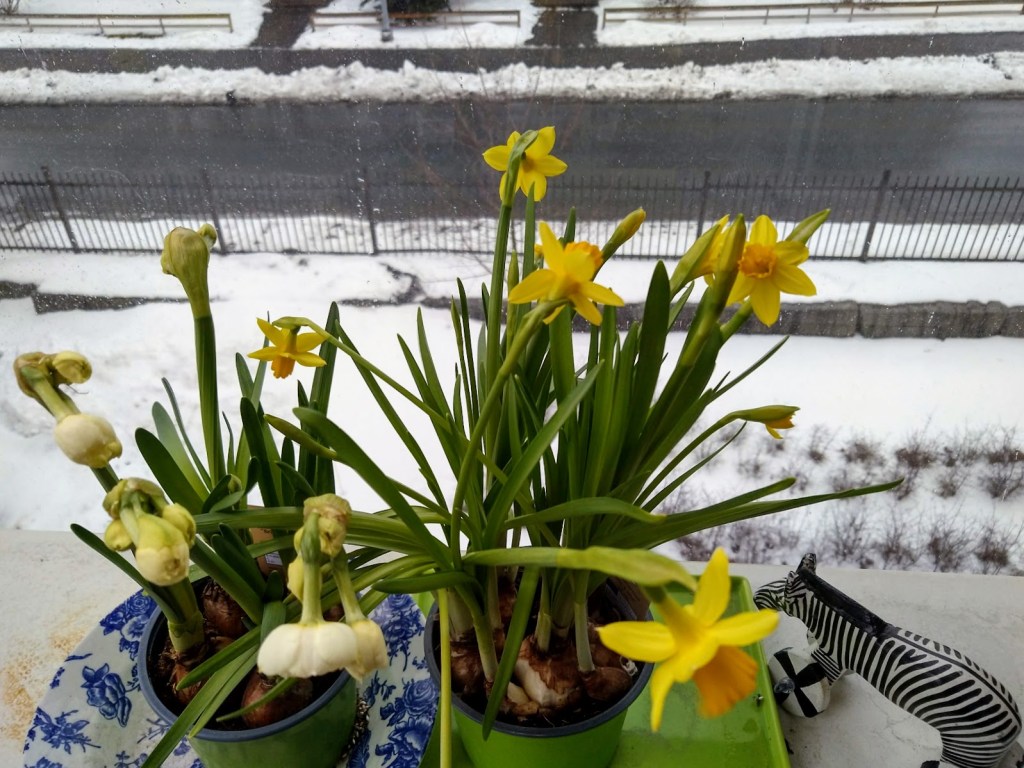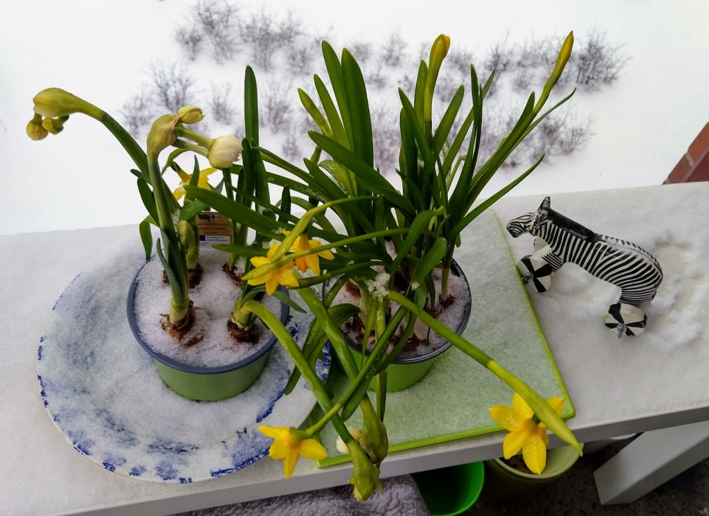 Alkuviikolla oli suloisen lämpimiä ja aurinkoisia päiviä. Tänään ikkunan takana pyrytti ja maa oli valkoinen. Pakkasta oli sen verran, ettei lumi sulanut saman tien.
