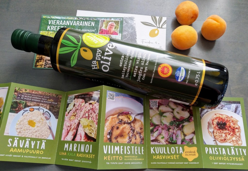 Kävin hakemassa läheisestä R-kioskista postipakettina tulleen kreetalaisen Happy Olive oliiviöljypullon, jota minulle oli suositeltua. Hyväähän se oli, mutta kallista. Ehkä tyydyn jatkossakin K- ja S-kaupan öljyihin.