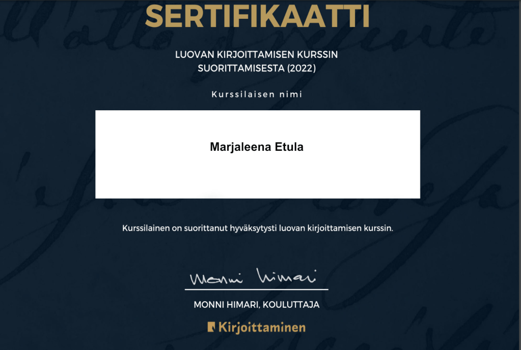 Olen suorittanut omaksi iloksi verkkokurssin, johon olin kovasti tyytyväinen. Tulostin sertifikaatin ja huomasin, että saan lähettää kaksi liuskaa arvioitavaksi. Suosittelen kurssia lämpimästi.