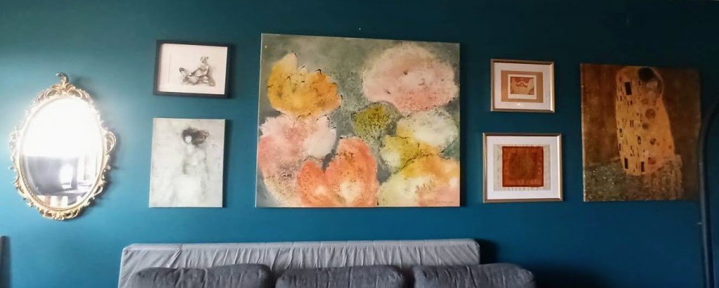 Anna soitti aamulla ja kertoi saaneensa taulut paikalleen turkoosilla olohuoneen seinällä. Näyttävimmät niistä ovat minun käsialaani. Taiteilija kiittää luottamuksesta.