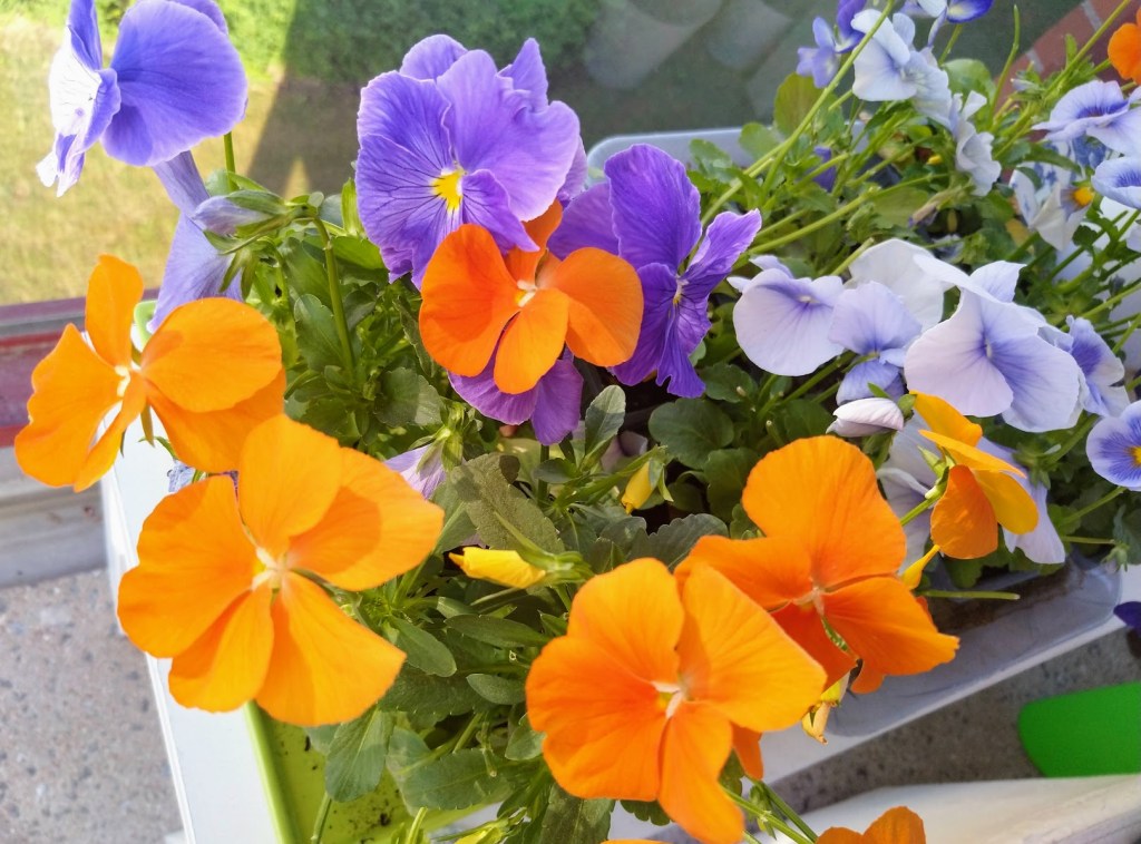 Helle jatkuu ja joudun kastelemaan orvokkeja pari kertaa päivässä. Ne kaipaavat isompaa ruukkua. Sellainen löytyy mökiltä, kun niin pitkällä ollaan.
