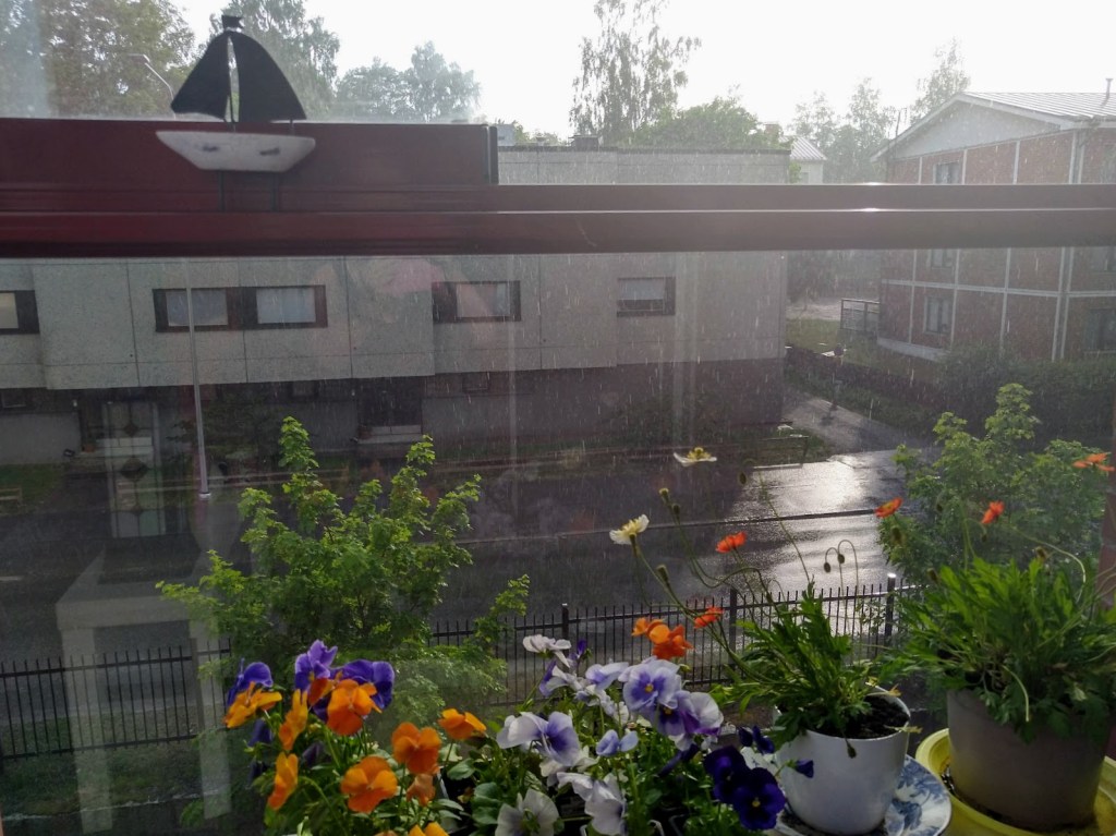 Ukkonen jyrisi tänäänkin ja pehmeä sade kasteli hiekkaisen pihapiirin, joka on ollut sakeana pölystä. Kokkasimme kotiruokaa, varhaisperunoita, korvasienikastiketta (viimevuotisia pakastimesta) ja salaattia. Nuoriso ehti iltapäivällä mökille, mutta lupasin mennä vasta sitten, kun vedet toimivat. Ruohikkopissillä käynti ei houkuttele.