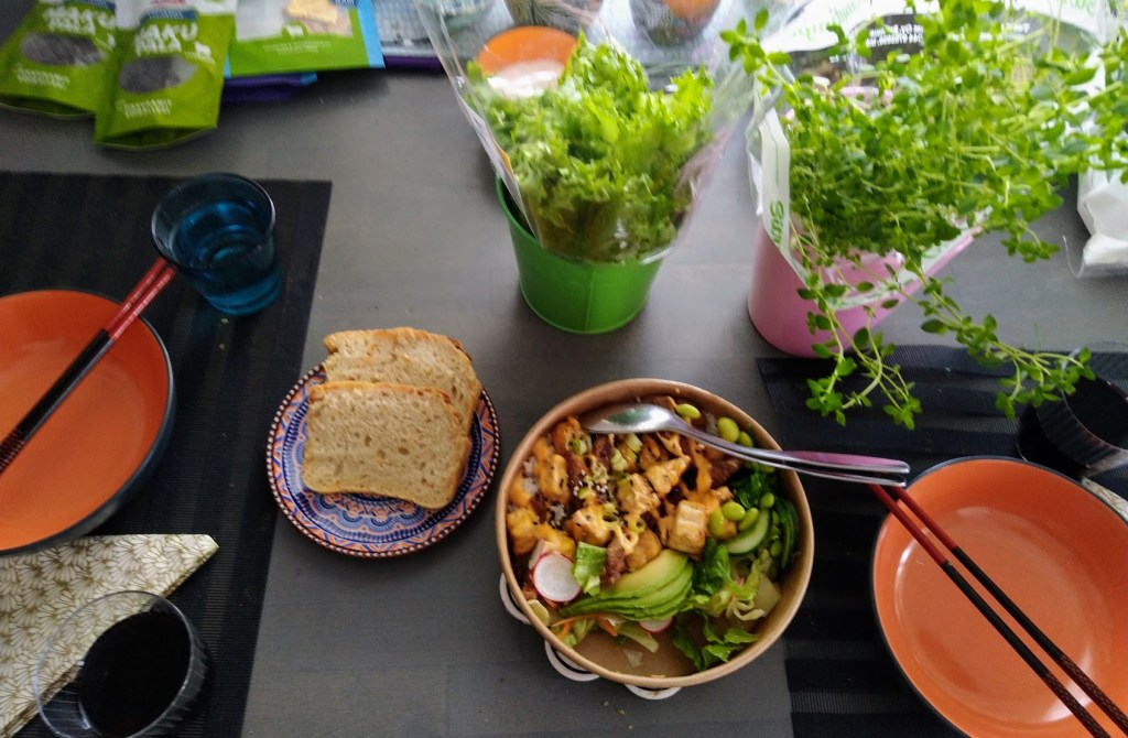 Kaupungista saa myös loistavaa noutoruokaa. Jaana lähetti viestin, että odottelee vietnamilaisen ravintola Kaunon poke bowl annoksen valmistusta. Lähetin peukunkuvan, odotan kieli pitkällä.