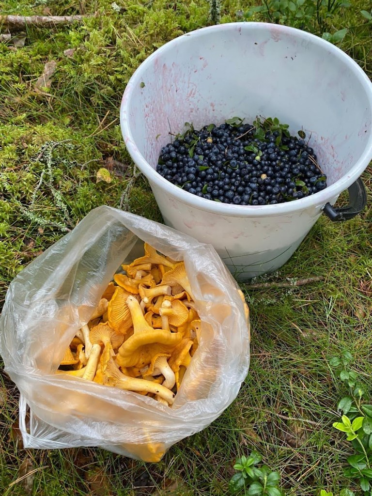 Lenkkeilimme Ulpun ja Otson hyvässä seurassa, perkasimme kantarelleja ja minä kokkasin lasten toivomuksesta spagettia ja jauhelihakastiketta, kuinkas muuten. Me muut söimme edellisenä päivänä kokattua lohikeittoa, joka oli erinomaisen hyvää. Saimme kotiin vietäviksi myös Miikan graavaamaa kalaa, mustikoita ja sieniä. Kiitoksemme!