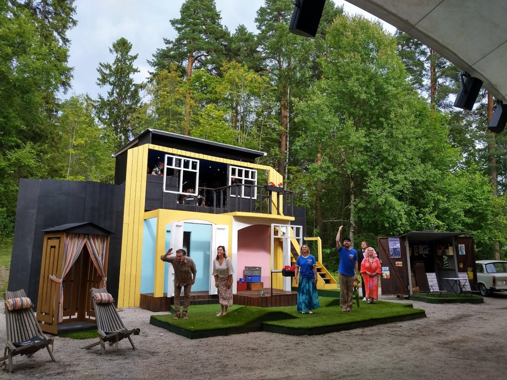 Katsomo oli katettu, mutta näyttelijät olivat taivaan alla. Esitys oli vauhdikas ja musiikkipitoinen. Pidimme kovasti.