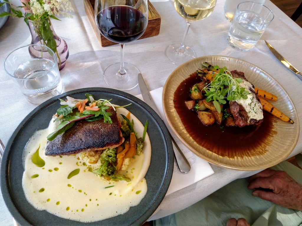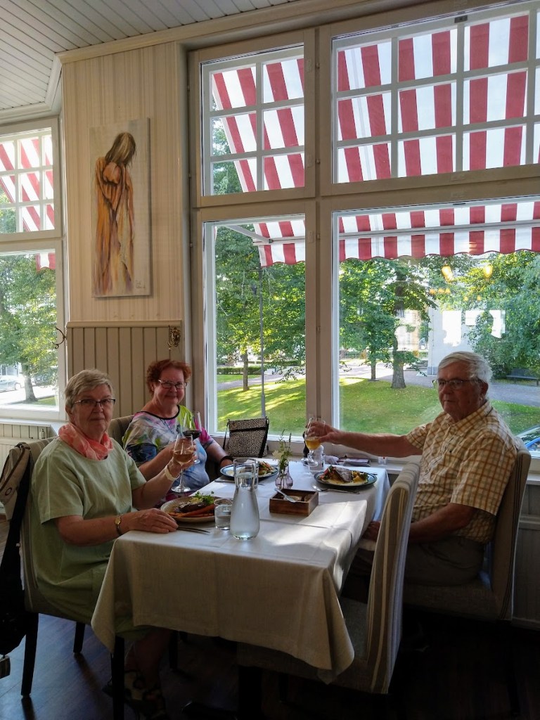 Jatkoimme matkaa Piparkakkutaloon, joka tarjosi tuoretta taimenta ja naudanfilettä punaviinikastikkeen kera. Annokset olivat runsaat ja maittavat. Palasimme kävelytie Reskan kautta ja istuimme hetkeksi terassille. Ilta oli pehmeä ja lämmin. Ilo jatkui minun luonani, sillä majoituimmme kaikki kolme pienelle parvekkeelleni nauttimaan punaviiniä ja juustoja.