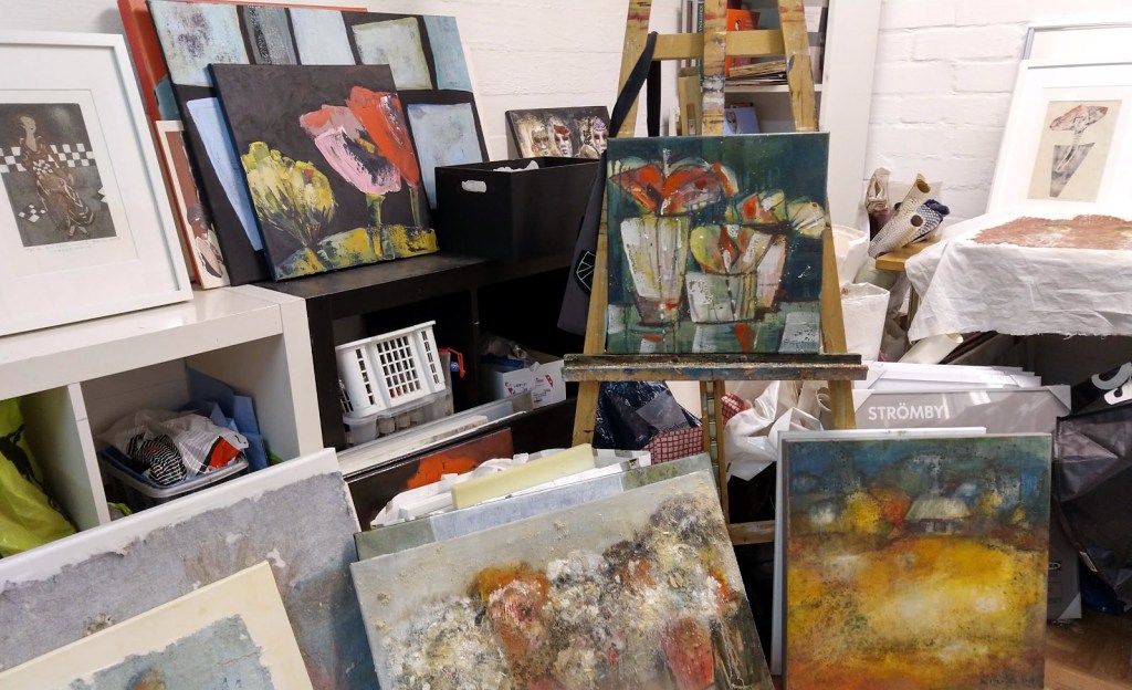 Haaveni on ollut, että ripustan julkkareiden yhteydessä pop up -taidenäyttelyn, sillä valmiita töitä on runsaasti. Ne ovat hautautuneet kellarivaraston ja työhuoneeni uumeniin. Ajattelen kauhulla, minne ne mahtuvat, jos joskus joudumme luopumaan grafiikanpajan tiloista. Olen valmis myymään teoksia puoleen hintaan.