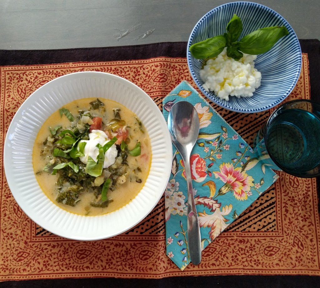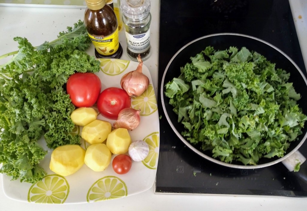 Ei tarvita muuta kuin tietenkin lehtikaalia, muutama peruna, sipulia ja tuoretta tomaattia sekä kasvislientä. Käytin kanafondia, joka mielestäni syventää makuja.