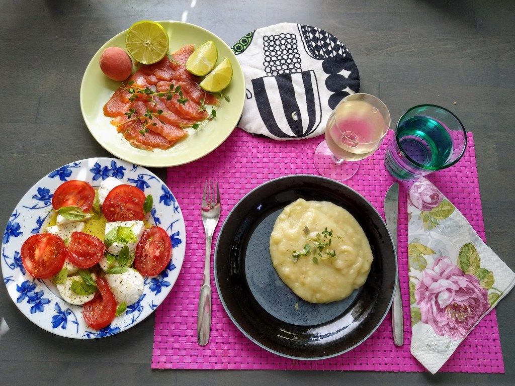 Miikan ja Lauran tuliaisina tuomia maa-artisokkia heidän kasvimaaltaaltaan oli vielä jäljellä. Kuorin ne kaikki ja keittelin perunoiden, salottisipulin sekä purjon kera lempeäksi soseeksi. Tarjosin Lapin kylmäsavulohen kera, sillä sitä oli S-Marketin tuoretiskillä tarjouksena. Makeat tomaatit ja mozzarella sopivat lisukkeiksi. ”Täsmäannos”, Jaana totesi tyytyväisenä.
