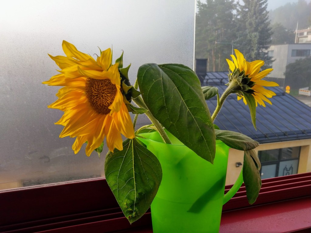 Aamulla satoi ja parvekkeella käydessäni sää tuntui suorastaan kolealta. On vaikea uskoa sääennusteita, jotka lupaavat helleviikkoa. Odottelen Fideliä vierihoitoon, sillä Jaanalla on aina uuden viikon alkajaisiksi kuntosalivuoro. Minulla on huomenna ja sen jälkeen suunnittelen meneväni pitkän pitkän tauon jälkeen raivaamaan työhuonetta. Kimmokkeena on lokakuun pajanäyttelyni, jonka teema on löytöjä työhuoneelta. Järjestän sinne varjonäyttelyn.