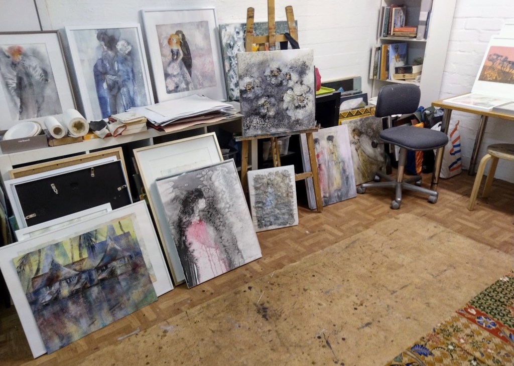 Olen osallistunut lukuisille maalauskursseille ja töitä on kertynyt runsaasti vuosien varrella. Koska tilat ovat rajalliset, toivon maalausten ja grafiikanvedosten löytävän uuden kodin. Olen kokeillut ennakkoluulottomasti erilaisia tekniikoita. Esillä on monipuolinen ripustus ja näyttely jatkuu alakerran työhuoneellani.