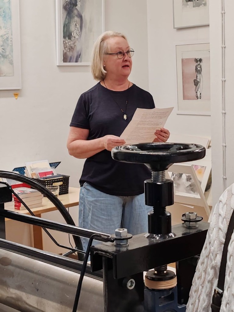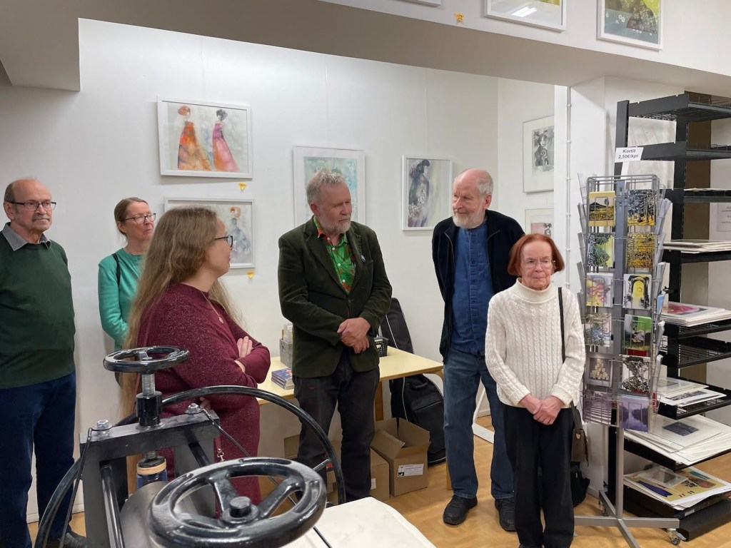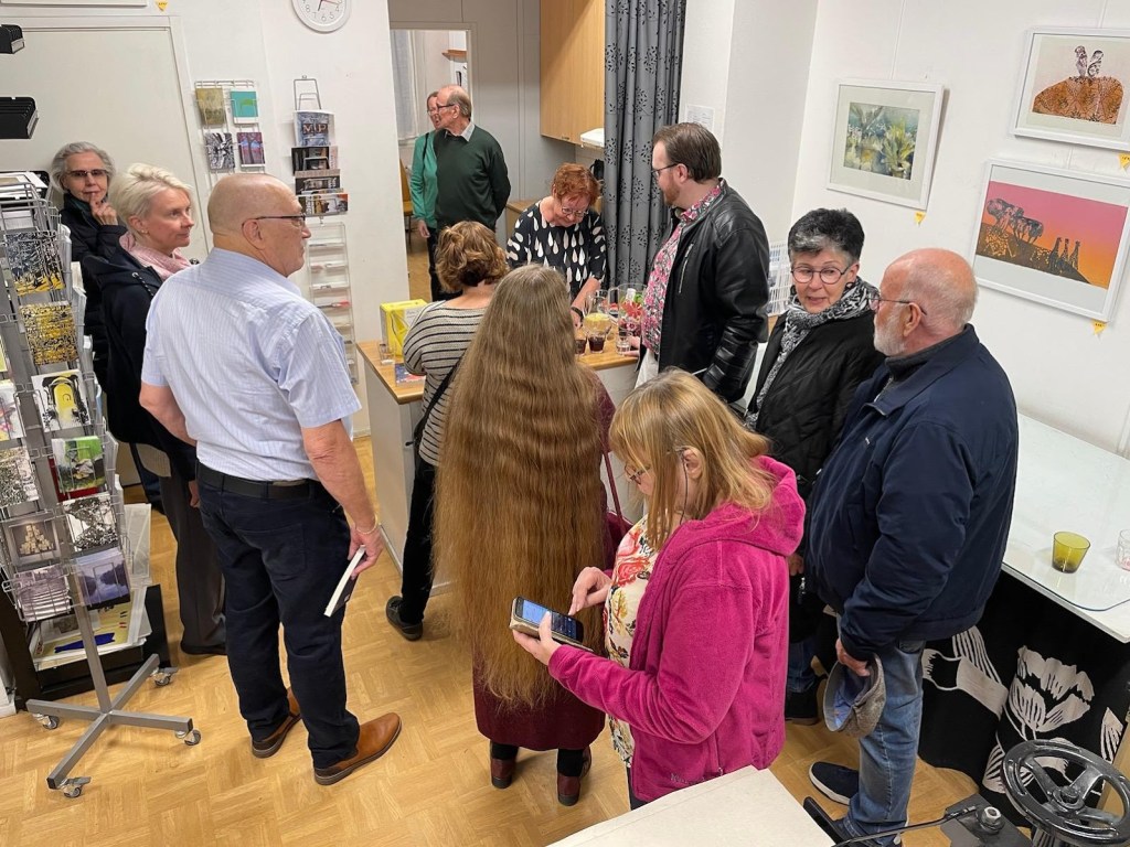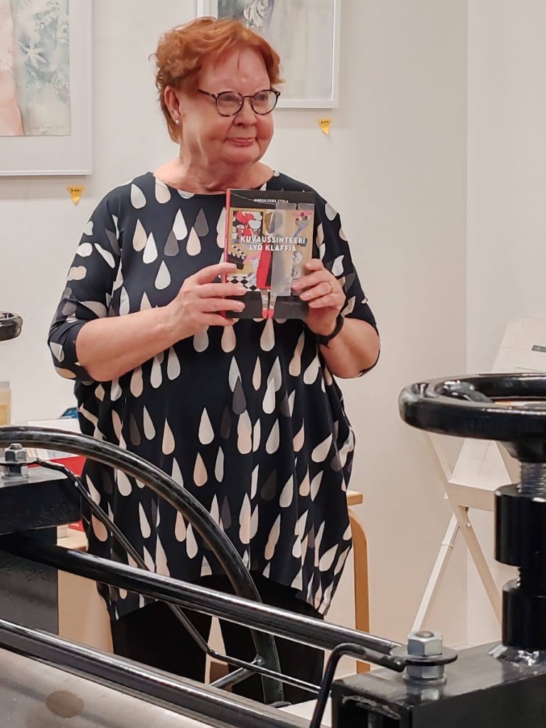 Olin täysin pyörryksissä iltahumun jälkeen. Sain apua kirjalaatikoiden kotiinkuljetuksessa. Grafiikanpajalle jäi muutamia kappaleita, jotka ovat myynnissä edulliseen 15 euron hintaan. Taidenäyttely jatkuu pajan puolella ja alakerran työhuoneessani 30.10. asti. Saa tulla tekemään edullisia löytöjä!