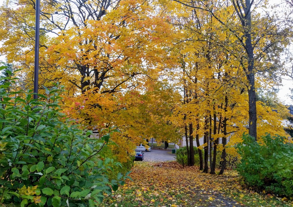 Sateet ovat tällä erää väistymässä ja upea ruska jatkuu. Kullankeltaiset puut ilahduttavat silmää. Eilen oli jopa hetken niin lämmintä, että istuimme hetken siskon ja Fidun kanssa parvekkeella. Edellisestä kerrasta on jo aikaa.