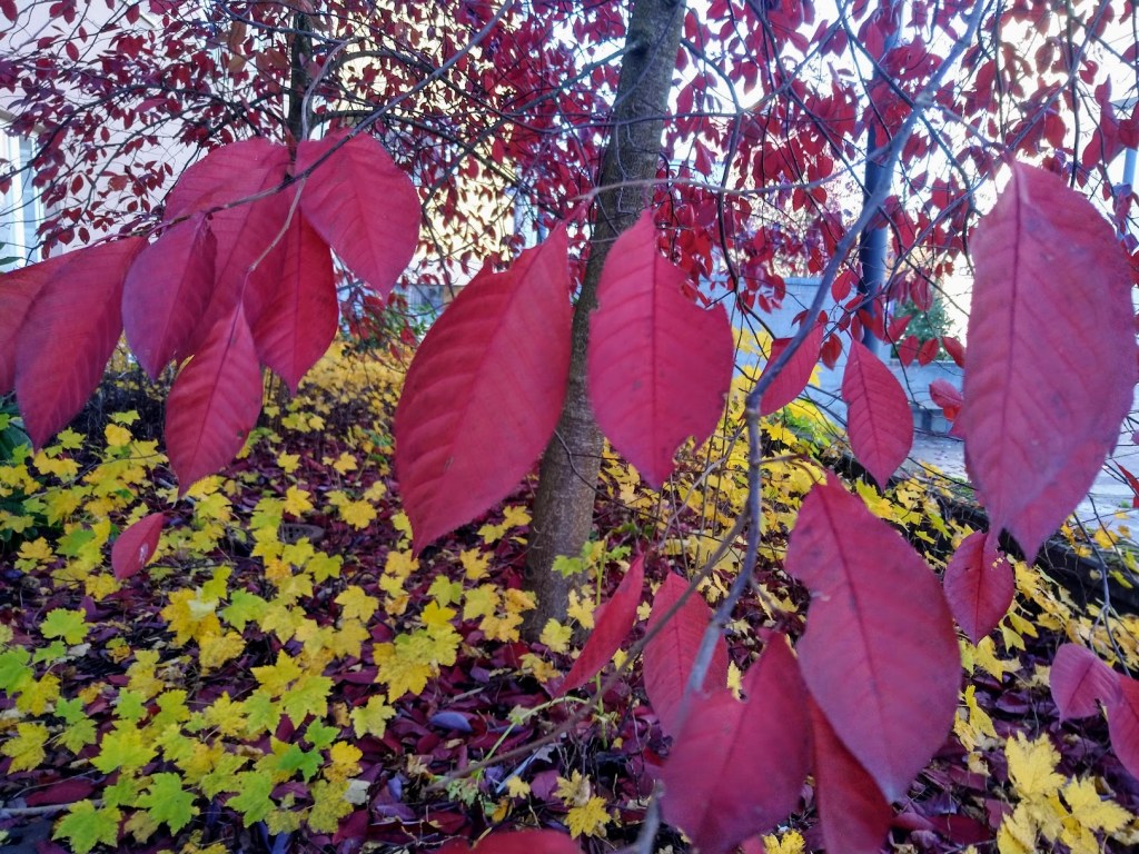 Olen nauttinut yllättävän lämpimistä syyspäivistä ja mielettömän kauniista ruskasta. Puissa on vielä lehtiä, mutta niin on maassakin. Katukäytävillä saa kahlata lehtimeressä.